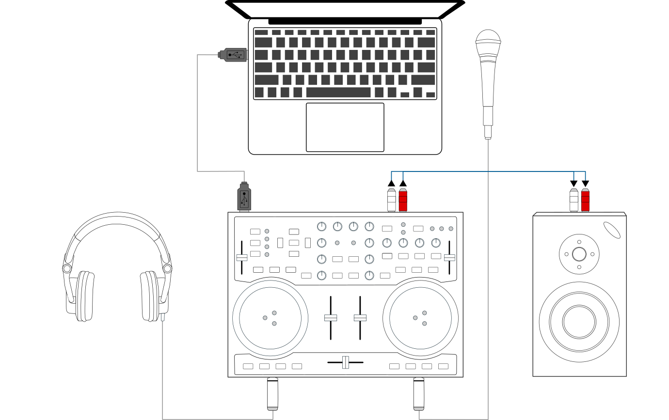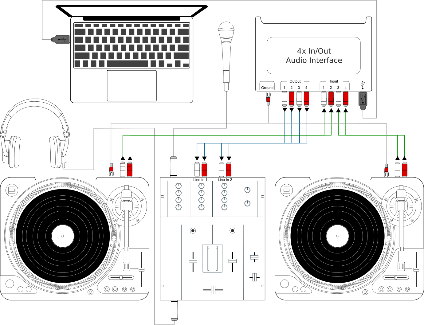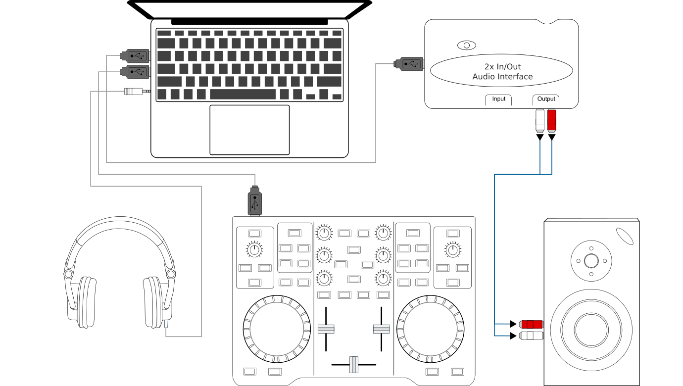 Many DJ controllers include an integrated multi-channel audio interface. A setup with this kind of controller may look like the diagram below: