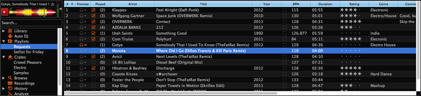If however you want to plan out a specific set and practice the transitions, you will want an ordered list of tracks. Playlists serve this purpose.