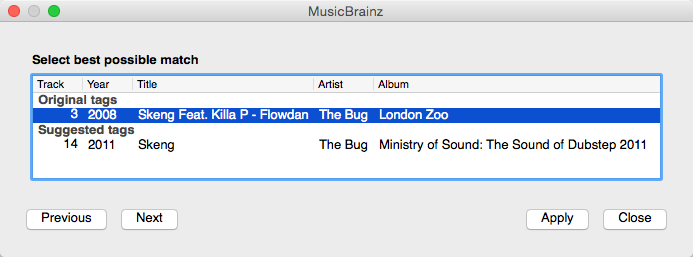 • Import from MusicBrainz: Look up metadata online by searching the MusicBrainz database and apply the search results to your tracks. See edit metadata.