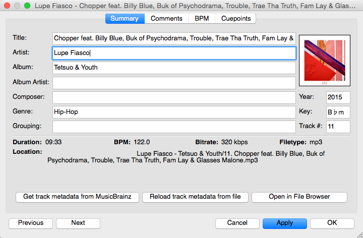 Similar to inline editing explained above, the properties dialog allows you to view and edit metadata such as title, artist, album, and view the full file name and path. Note that you can not edit multiple files at once.