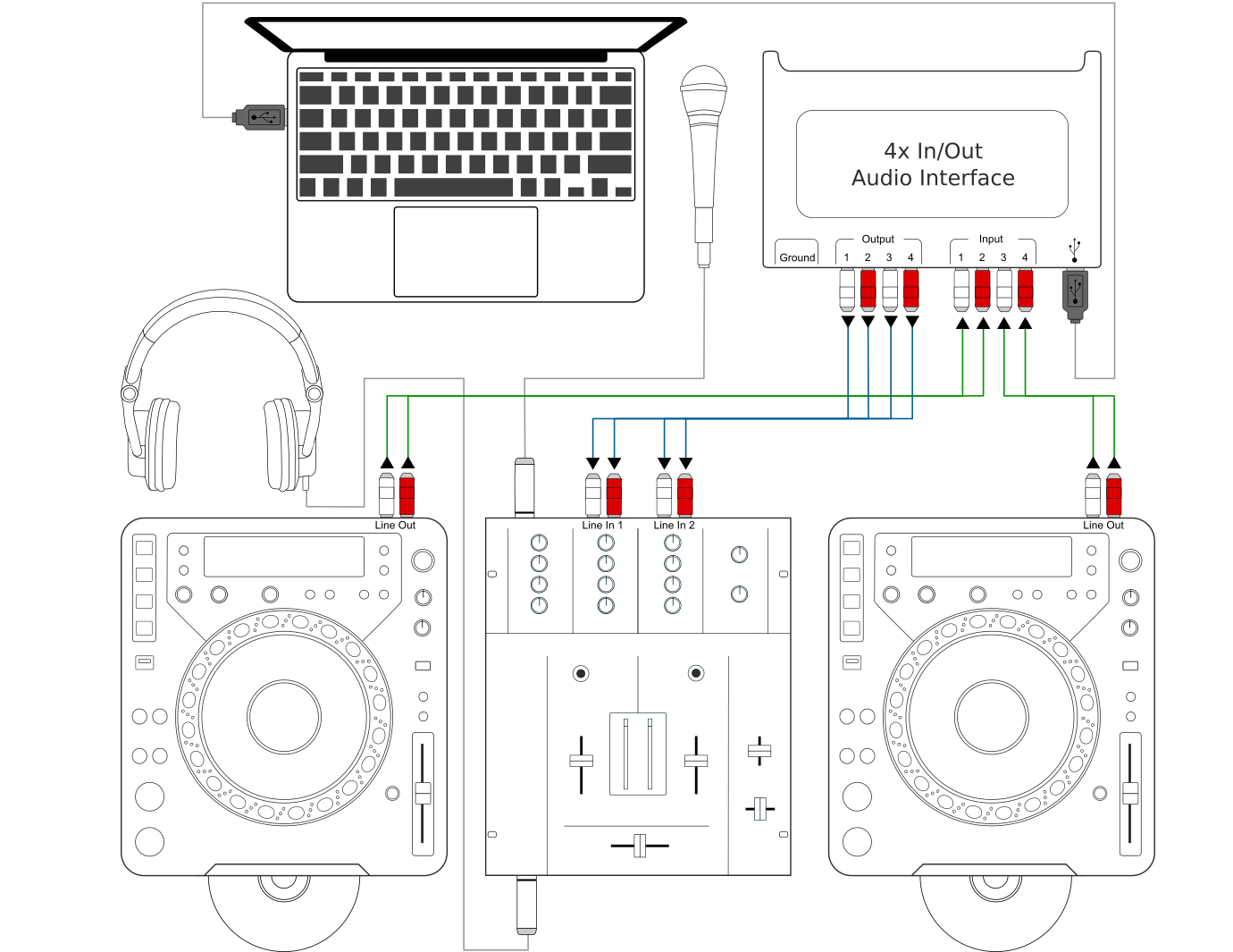 For turntables a typical setup is depicted in the figure below. First, connect the RCA cables from the turntables to the inputs on your audio interface. Second, connect the outputs of your audio interface to the inputs on your mixer.