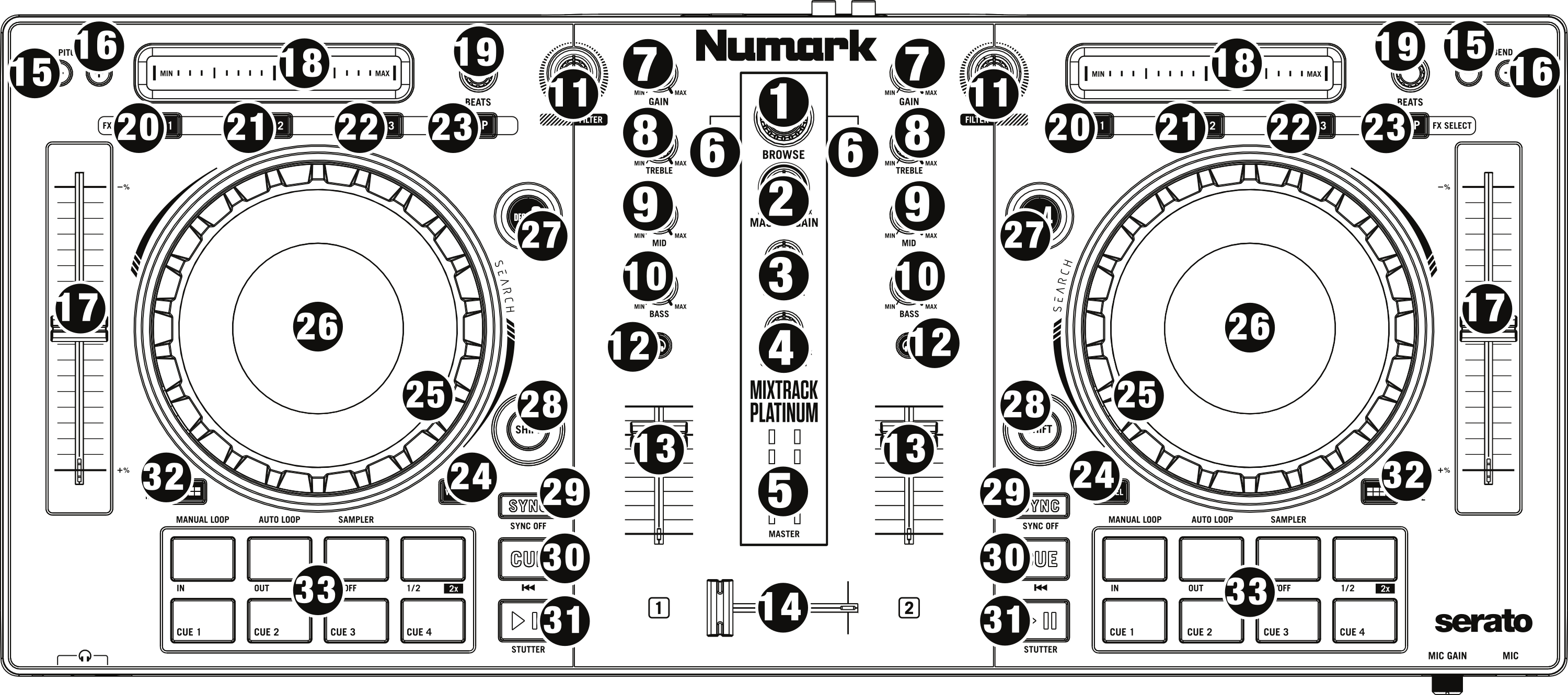 The Numark Mixtrack Platinum is a 2 channel (with 4 channel layering) entry level DJ controller with an integrated audio interface. The stand out feature of the Mixtrack Platinum is the LCD displays integrated into the jog wheels. It is a USB Audio and MIDI Class compliant device and works with Linux, macOS, and Windows.